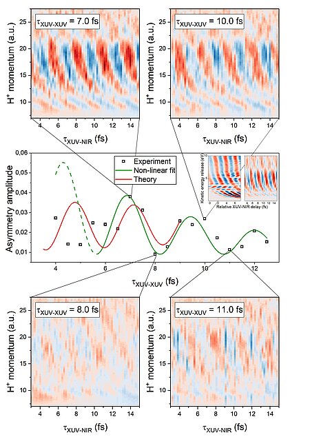 The figure shows the main outcome of the experiment and the theoretical calculations. By varying the delay between the pair of attosecond pulses and an infrared pulse, an oscillation was observed in the position where the hole was preferentially observed at the end of the experiment. The amplitude of this oscillation (i.e. the degree to which preferential hole localization at the end of the experiment could be achieved, that is to say the degree of coherence) depends on the delay between the two attosecond pulses. The figure shows that entanglement in the of H2+ ion + photoelectron systems occurs at the expense of the electronic coherence in the remaining H2+ molecular ion, thus allowing one to control this coherence by just varying the delay between the pulses.